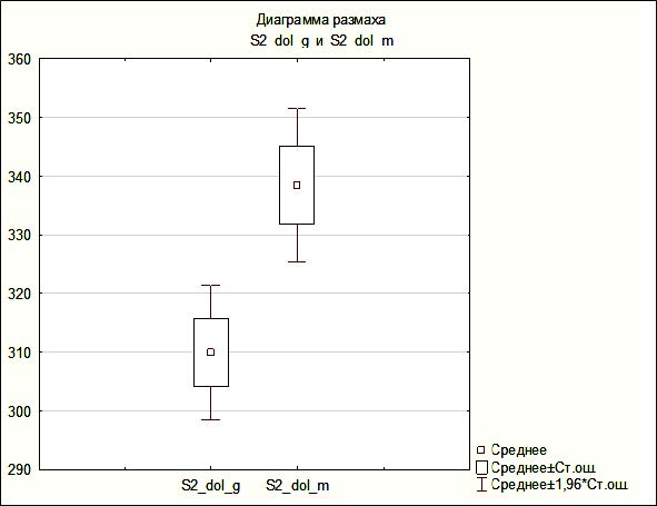 Проведенное сравнение между девушками и юношами показало достоверность различий (р < 0,05) (рис. 2). При сравнении площади сектора S2 у девушек среднее значение этого сектора составило 309,93 мм² и разброс – от 182,42 до 495,95 мм². У юношей этот показатель выше: 338,40 мм² – среднее значение, минимальное – 191,1 мм² и максимальное – 545,35 мм².