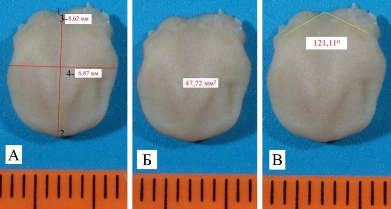 Толщина языка определялась штангенциркулем с ценой деления 0,1 мм в сагиттальной плоскости на уровне пограничной борозды языка. Площадь спинки языка была измерена с помощью инструмента «площадь свободной фигуры» программного обеспечения ToupView (ToupTek Corporation) (рис. 1 Б). Был оценен угол, образованный пограничной бороздой языка в градусах (рис. 1 В).