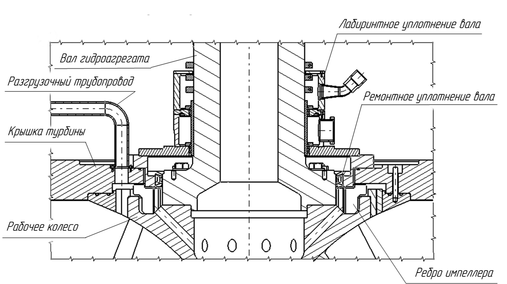 При вращении ротора импеллер также вращается. На воду, поступившую в зону импеллера из проточной части, действует сила гидростатического давления, а также противоположно направленная ей центробежная сила [2]. Импеллер уводит основной объем жидкости к трубопроводам. По ним вода поступает в отсасывающую трубу. Часть жидкости, оставшейся в зоне ступицы рабочего колеса, может попасть в зону лабиринтного уплотнения. Из верхней полости этого уплотнения жидкость уводится через слив. Лабиринтное уплотнение имеет минимальный износ [3], импеллеры, как правило, изготавливаются из нержавеющих материалов [2], в результате чего комбинированное уплотнение данного типа имеет высокий срок службы.