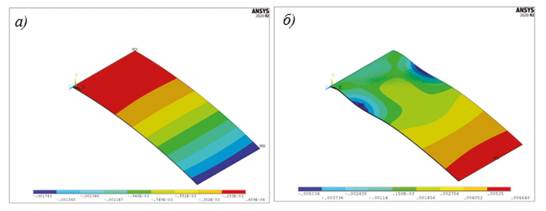 Рис. 1. Прогиб точек пластины, соответствующий: а — первому типу закреплений; б — второму типу закреплений [6]