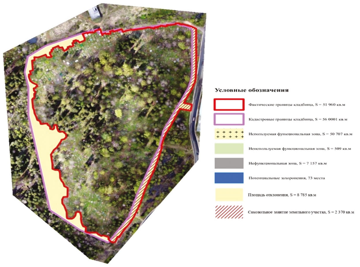 Также было выявлено, что кадастровые границы кладбища имеют несоответствие с фактическими, в связи с этим возникло отклонение фактической площади от кадастровой в большую сторону на 8 785 м2. Было выявлено и самовольное занятие земельного участка, не входящего в кадастровые границы кладбища (рис. 2).
