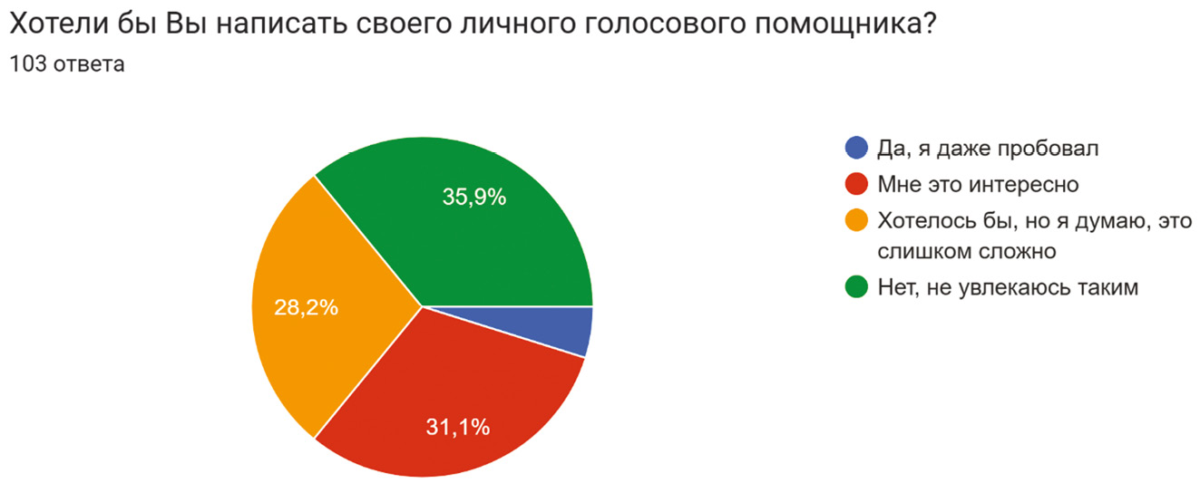 Обоснование. Согласно результатам опроса (рис. 1), Python занимает первое место (50,5 %) среди языков программирования, которые пользователи хотели бы освоить лучше/начать изучать. Также 46 % опрошенных (рис. 2) жалуются на то, что не смогли найти удобное приложение для освоения программирования, 28 % указали, что приложения из данной категории, представленные на рынке, требуют серьезных доработок. При этом 31,1 % (рис. 3) хотели бы написать своего голосового помощника, 28,2 % хотят, но думают, что это слишком сложно.