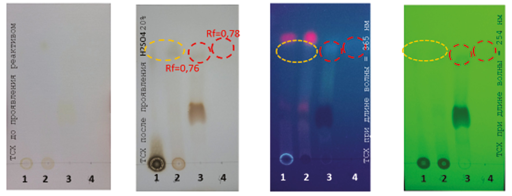 Для проведения хроматографического анализа были использованы ТСХ-пластинки марки «Sorbfil ПТСХ-А-УФ», извлечения наносили при помощи капилляра. В ходе предварительных исследований было установлено, что оптимальной системой для проведения тонкослойной хроматографии является система хлороформ — этанол (2 : 1), позволяющая получить хроматографические профили ацетоновых извлечений из сиропа и водно-спиртового извлечений эвкалипта прутовидного, на основе которого был изготовлен данный сироп.