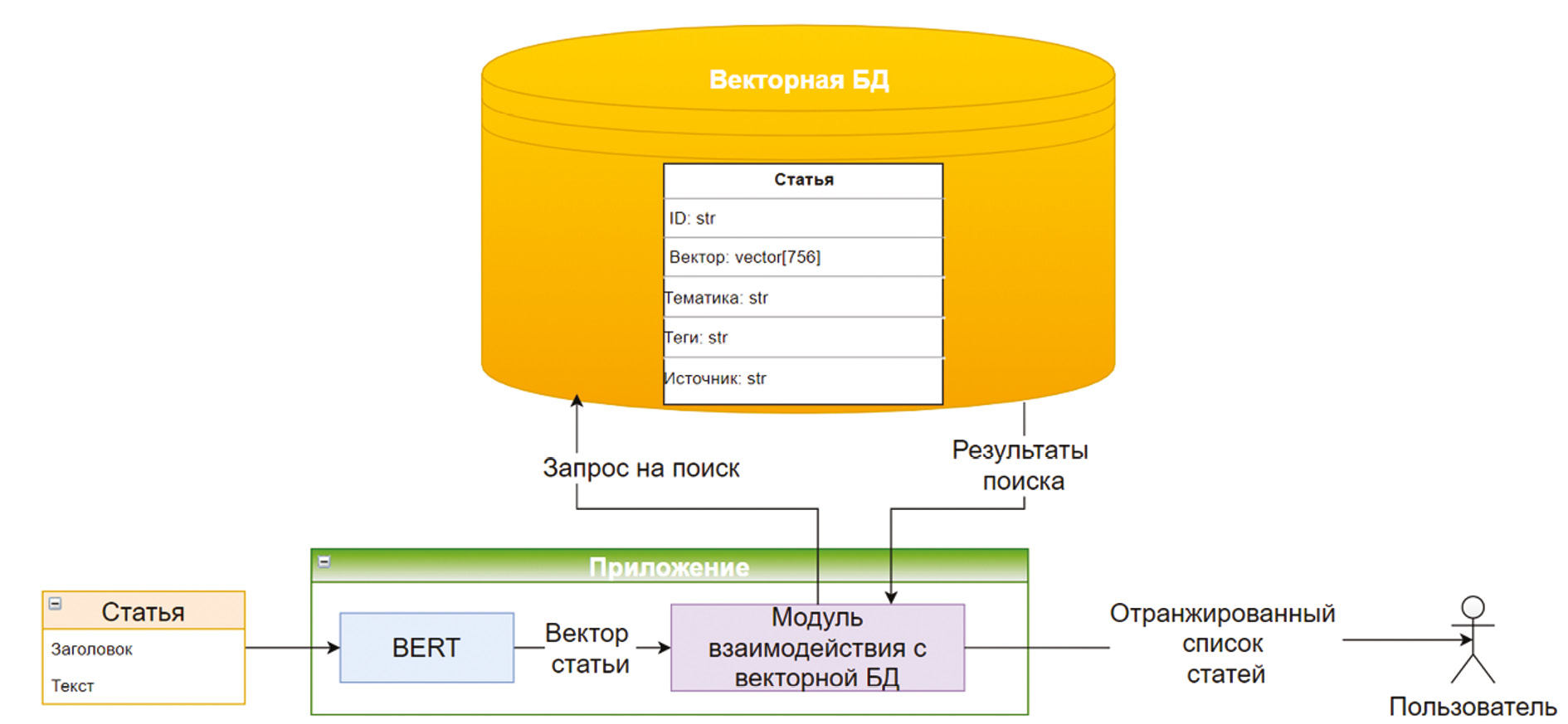 Сам сервис является веб-приложением, которое в качестве запроса от пользователя принимает статью: тему (заголовок) и основной текст. Данная информация векторизуется обученной моделью BERT, и по полученному вектору из базы данных получаем список похожих статей и значение близости. Список, отранжированный по близости, выдается пользователю. Данный процесс показан на рисунке 2.