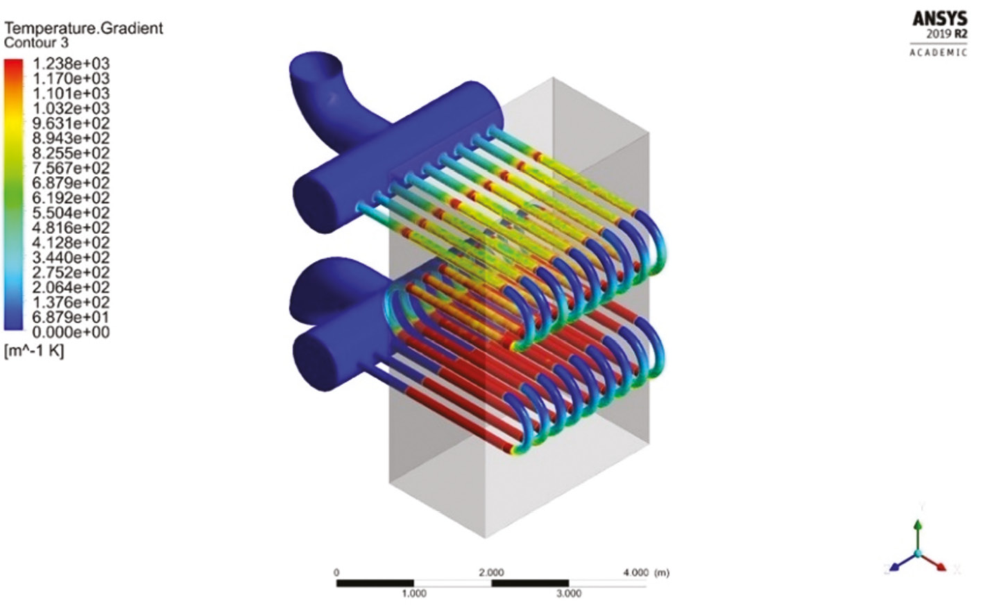 На рис 1. представлены графические результаты моделирования процесса теплообмена на примере пароперегревателя котла-утилизатора. Технико-экономический расчет разработанного метода производится по числу часов простоя газовой и паровой турбины, так как при отказе котла-утилизатора прекращает свою работу парогазовая установка (ПГУ), в состав которой входят: газотурбинная установка (ГТУ) и паротурбинная установка (ПТУ). Число часов простоя в среднем составляет две недели, однако, используя разработанное решение, возможно сократить эту величину в два раза, то есть до 168 ч [1].